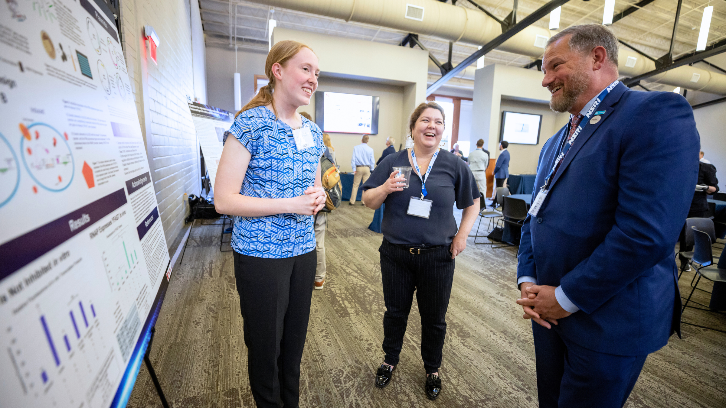 "Building Resilience Against Emerging Threats," held in April 2025, featured 16 faculty as facilitators, breakout presenters and poster presenters as well as multiple students. Pictured: UNL student Laura Kirshenbaum and Dr. Nicole Buan, professor of biochemistry, sharing their poster with Brig. Gen. (Ret.) William King who presented a keynote at the event. Read event summary >