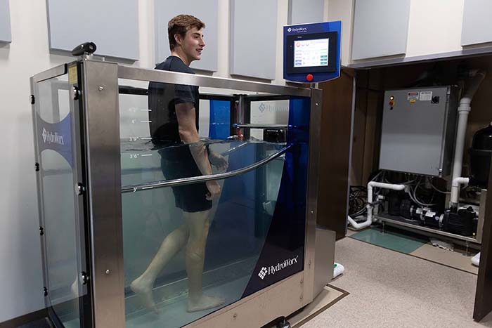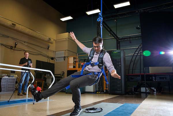 Pictured: Dr. Likens (left) with graduate assistants Taylor Wilson (middle) and Kolby Brink (right). Wilson stands on an instrumented treadmill while wearing inertial measurement units. The equipment helps measure movements during locomotion.